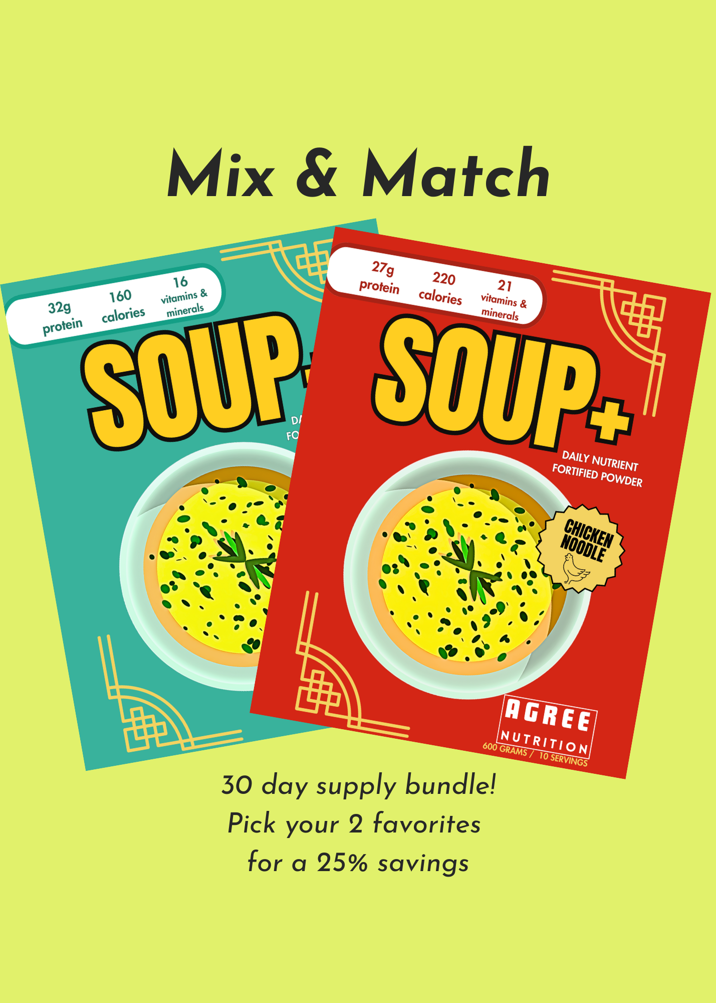 The Soup+ Monthly Subscription includes two full-size pouches — one of each flavor: Hearty Chicken and Miso Balance.